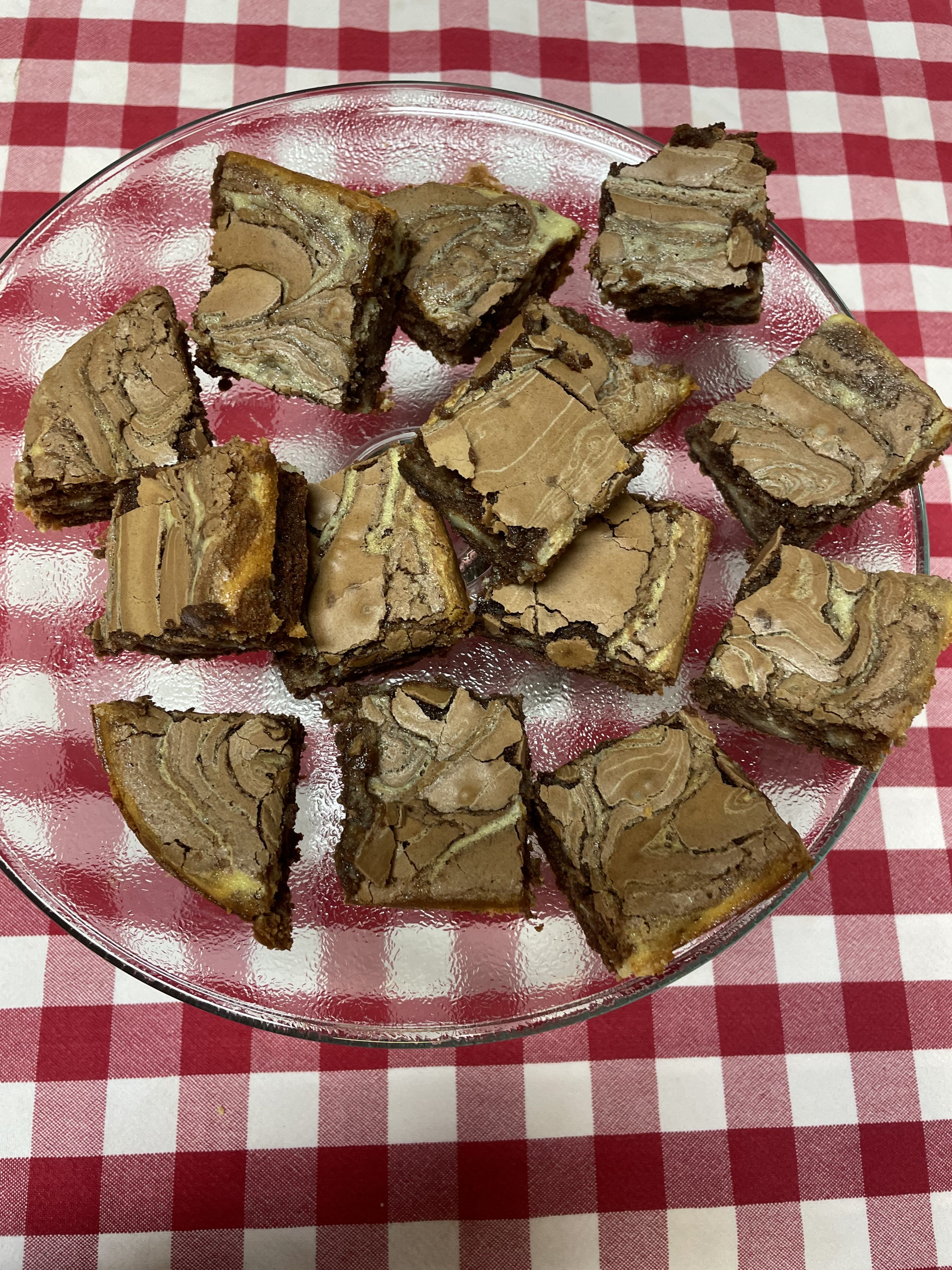 Spread 1/2 of the chocolate batter in greased 8″ or 9″ square pan. On top of that, add in cream cheese mixture, spreading evenly across the top. Top with tablespoonfuls of remaining chocolate batter. Zigzag a spatula through batter to marble.