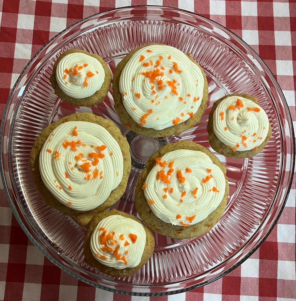 Since we are on the topic of carrot cake, and I had A LOT of extra carrots, check out my last post, I decided to do cookies as well! Now, this is not the same recipe as before, no cake mix required. And these cookies are not as “golden” as the muffins.